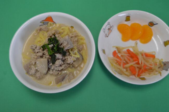 ~ 今日の給食 ~ ・クリーミー坦々麺 ・もやしと人参のナムル ・みかん ~ 今日のおやつ ~ ・牛乳 ・ゆかりおにぎり