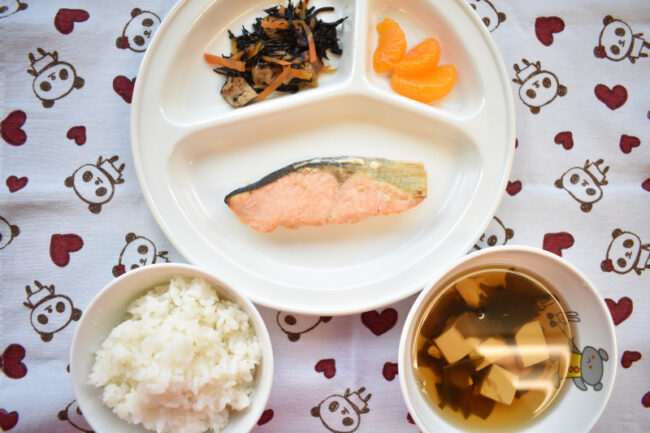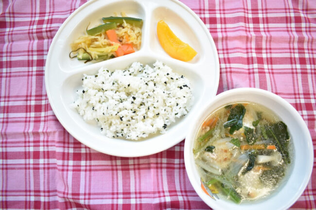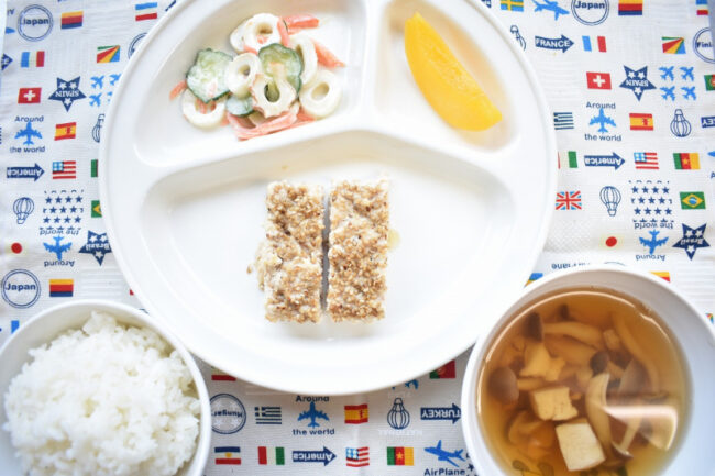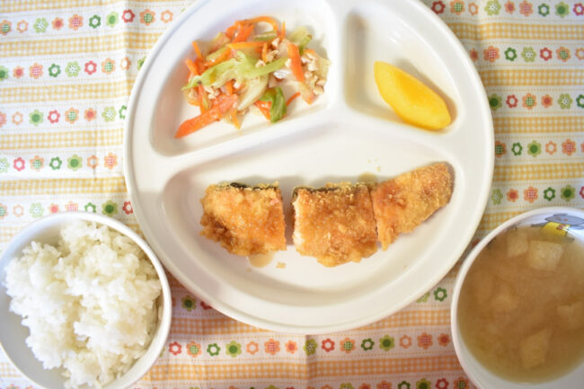 ~ 今日の給食 ~ ・鮭のフライ ・三色ナムル ・ごはん ・豆腐となめこのみそ汁 ・もも ~ 今日のおやつ ~ ・牛乳 ・彩りそうめん