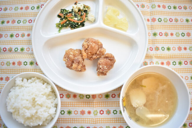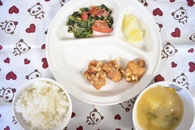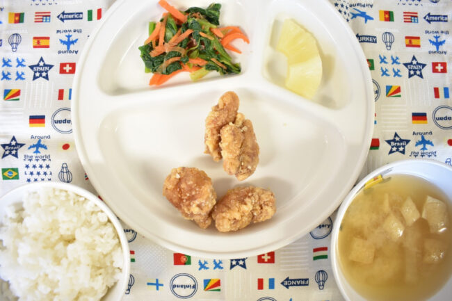 ~ 今日の給食 ~ ・鶏の唐揚げ ・ほうれん草とトマトのツナサラダ ・ごはん ・じゃがいもと玉ねぎのみそ汁 ・パイン ~ 今日のおやつ ~ ・牛乳 ・おひさまゼリー ・甘辛せんべい  …
