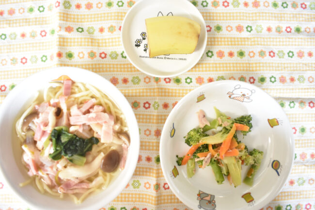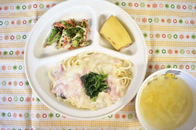 ~ 今日の給食 ~ ・クリームスパゲティー ・ブロッコリーと人参のゆかり和え ・白菜とコーンのスープ ・バナナ ~ 今日のおやつ ~ ・牛乳 ・わかめおにぎり