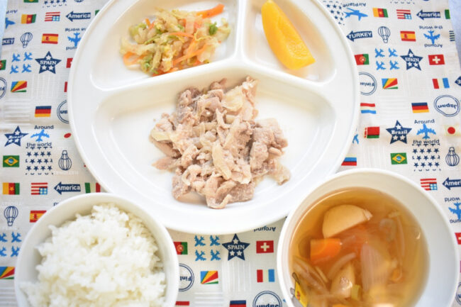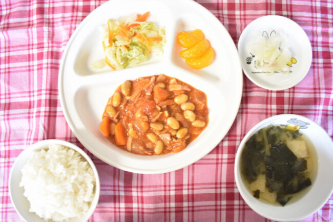 ~ 今日の給食 ~ ・ポークビーンズ ・キャベツと人参のごま和え ・ごはん ・ほうれん草と油揚げのみそ汁 ・みかん ~ 今日のおやつ ~ ・麦茶 ・レアヨーグルトケーキ