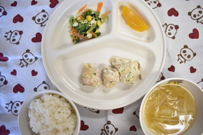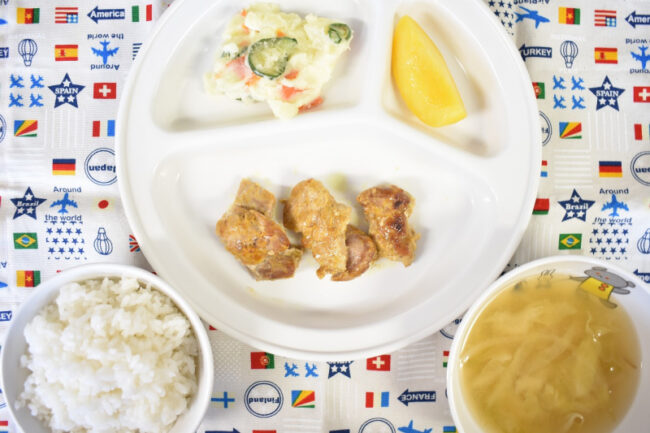 ~ 今日の給食 ~ ・タンドリーチキン ・ポテトサラダ ・ごはん ・キャベツともやしのみそ汁 ・もも ~ 今日のおやつ ~ ・牛乳 ・ジャムサンド