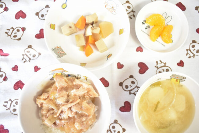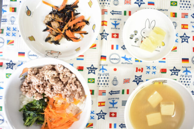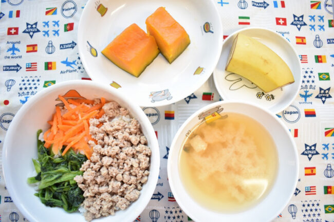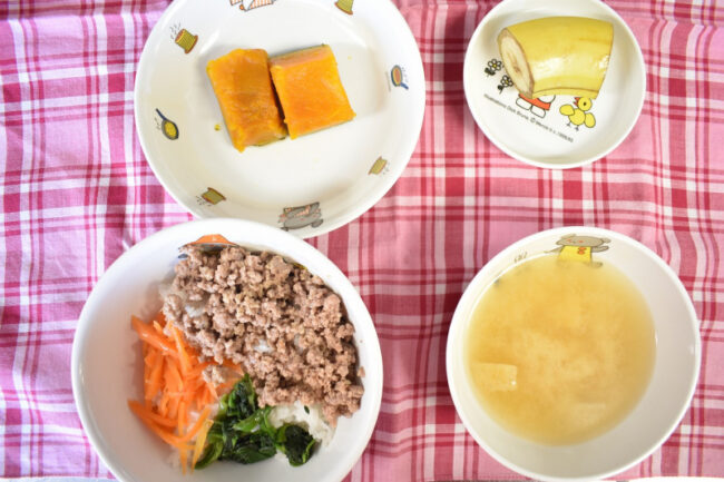 ~ 今日の給食 ~ ・じゃがいものそぼろ煮 ・ほうれん草と人参のおかか和え ・ごはん ・高野豆腐としめじのみそ汁 ・みかん ~ 今日のおやつ ~ ・牛乳 ・マシュマロサンド