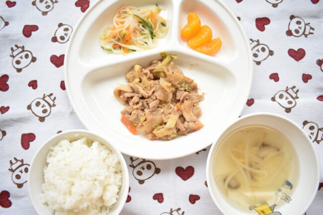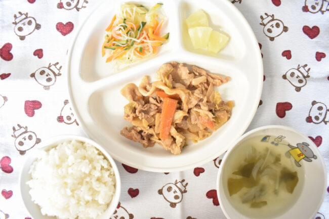 ~ 今日の給食 ~ ・回鍋肉 ・ブロッコリーと人参のゆかり和え ・ごはん ・春雨スープ ・パイン ~ 今日のおやつ ~ ・牛乳 ・ぶどうゼリー ・ビスケット