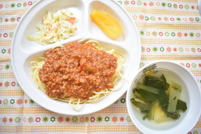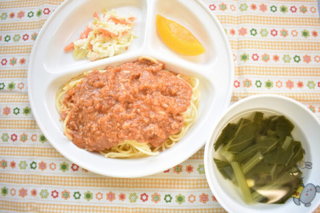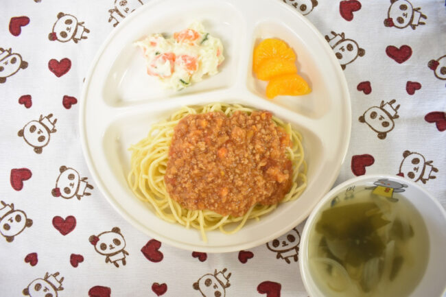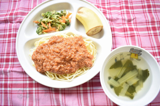 ~ 今日の給食 ~ ・ミートソーススパゲティー ・キャベツと人参のゆかり和え ・ほうれん草とコーンのスープ ・バナナ ~ 今日のおやつ ~ ・牛乳 ・ごま塩おにぎり
