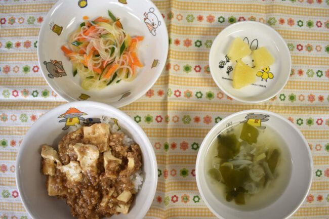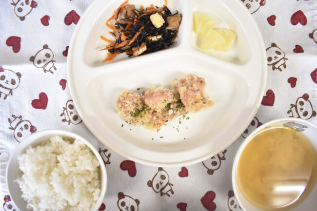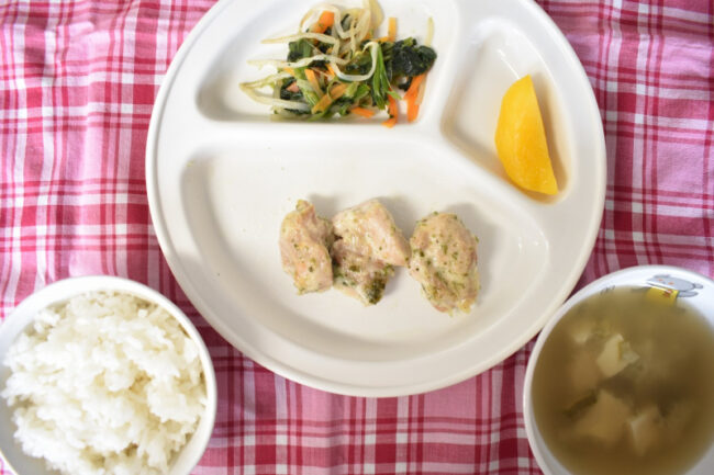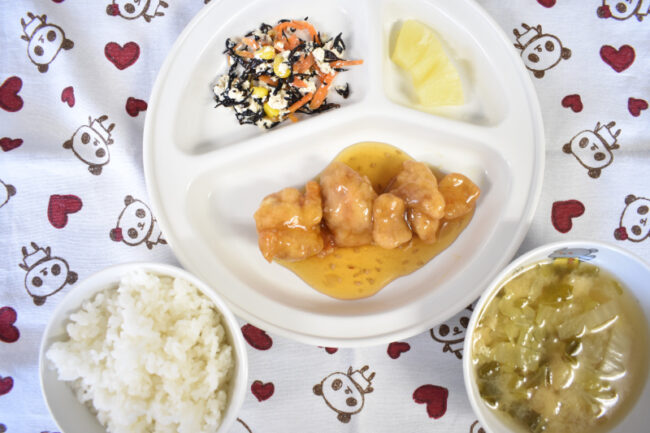 ~ 今日の給食 ~ ・豆腐入りチキンナゲット ・三色ナムル ・ごはん ・さつまいもと玉ねぎのみそ汁 ・パイン ~ 今日のおやつ ~ ・牛乳 ・フルーツゼリー ・ビスコ
