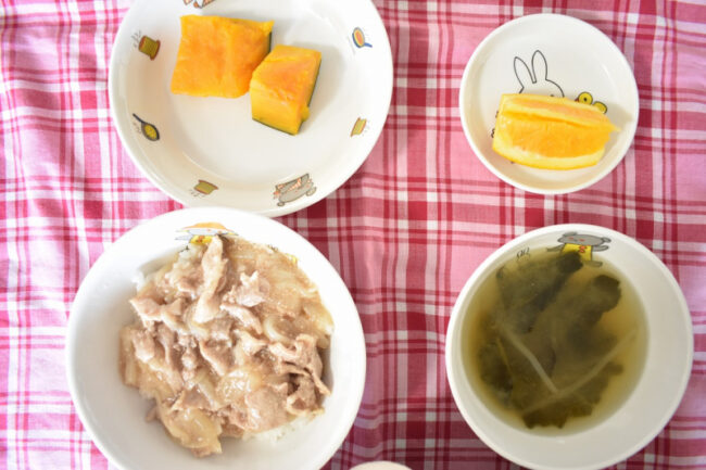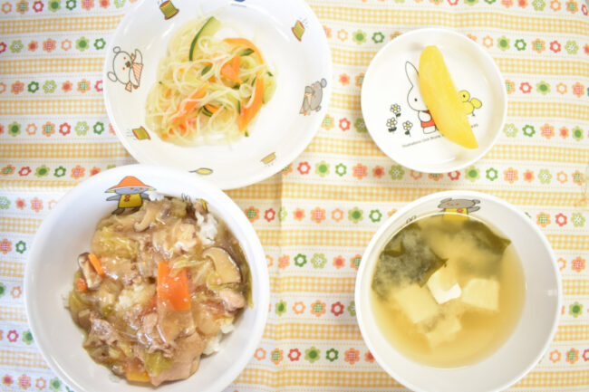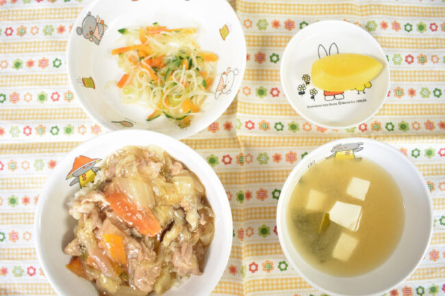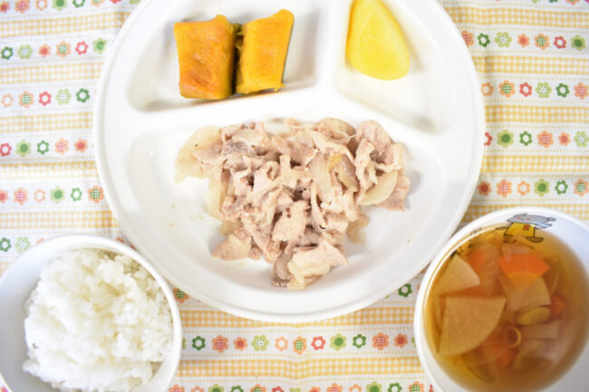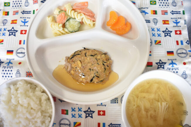 ~ 今日の給食 ~ ・切り干し大根のハンバーグ ・かぼちゃの煮つけ ・ごはん ・なすと油揚げのみそ汁 ・もも ~ 今日のおやつ ~ ・牛乳 ・薄焼きピザ
