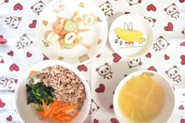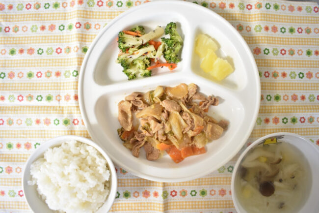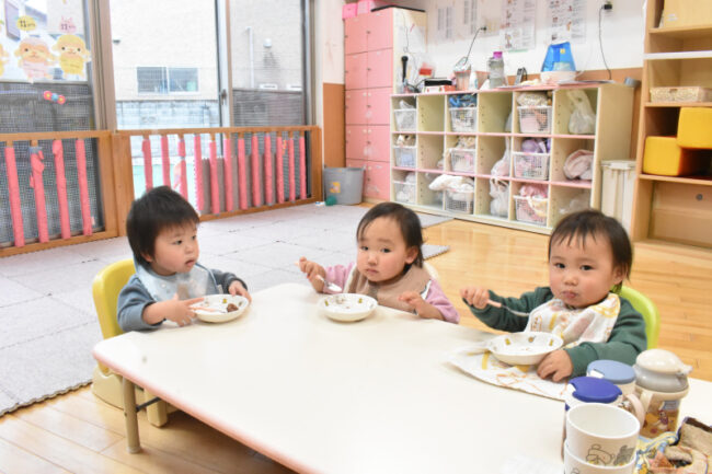 <もも組> 離乳食を保護者の方と話し合いながら進め、今では全員が普通食となりました。だんだんと好きなもの・嫌いなものを伝えてくれるようにもなり、先生と一緒にスプーンを使ってパクパクと食べて完食できています。 …