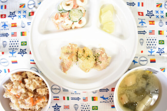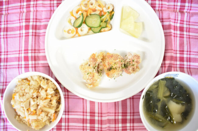 ~ 今日の給食 ~ ・鶏肉のパン粉焼き ・ちくわときゅうりの和え物 ・たけのこごはん ・お麩とほうれん草のみそ汁 ・パイン ~ 今日のおやつ ~ ・牛乳 ・ポテトフライ