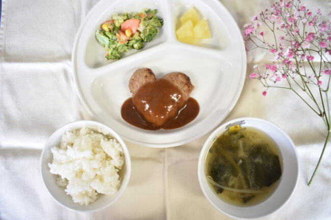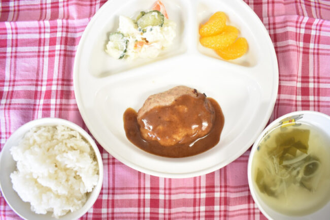 ~ 今日の給食 ~ ・デミグラスソースハンバーグ ・ポテトサラダ ・ごはん ・わかめスープ ・みかん ~ 今日のおやつ ~ ・麦茶 ・レアヨーグルトケーキ