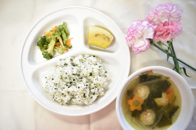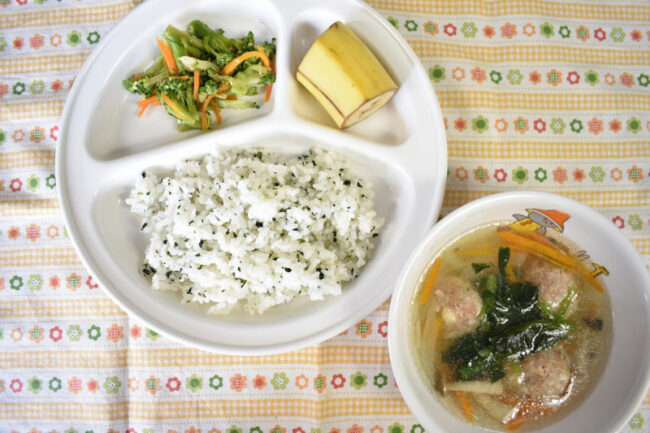 ~ 今日の給食 ~ ・肉団子のスープ ・ブロッコリーと人参のごま和え ・わかめごはん ・バナナ ~ 今日のおやつ ~ ・牛乳 ・いちご大福 今日の給食は、お花見メニ…