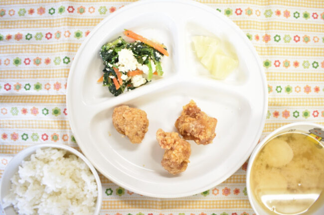 ~ 今日の給食 ~ ・鶏の唐揚げ ・小松菜と人参のおかか和え ・ごはん ・大根と油揚げのみそ汁 ・パイン ~ 今日のおやつ ~ ・コーンスープ ・ウエハース