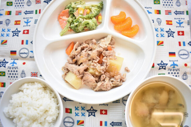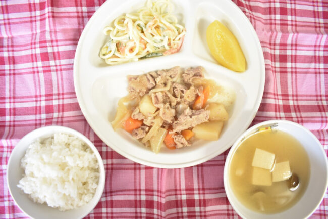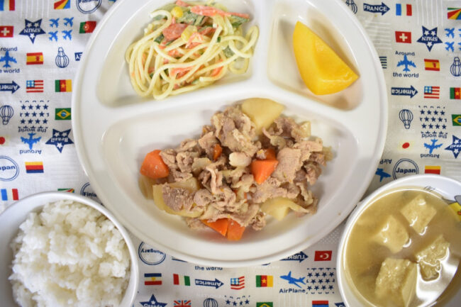 ~ 今日の給食 ~ ・肉じゃが ・ブロッコリーとコーンの和え物 ・ごはん ・お麩とわかめのみそ汁 ・みかん ~ 今日のおやつ ~ ・牛乳 ・マカロニきな粉