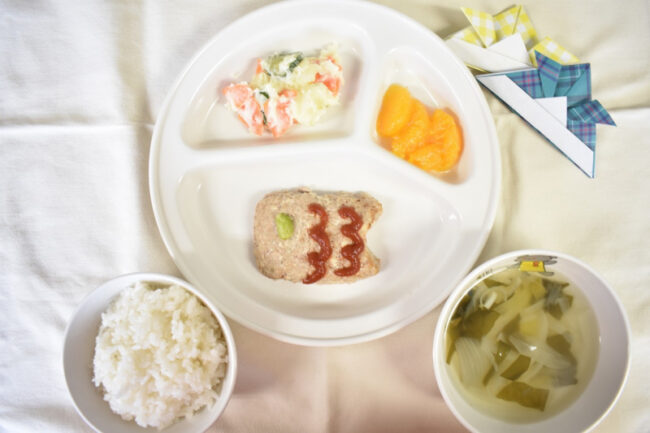 5月5日は「こどもの日」です。園では今日、「こどもの日祝い」を行いました。 その為、給食は「こいのぼりハンバーグ」、午後おやつは「かぶとパイ」を食べました。 子ども達は、…