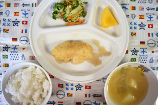 ~ 今日の給食 ~ ・カレイのフライ ・ブロッコリーと人参のゆかり和え ・ごはん ・じゃがいもと玉ねぎのみそ汁 ・もも ~ 今日のおやつ ~ ・牛乳 ・マカロニきな粉