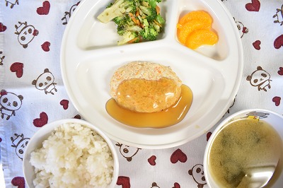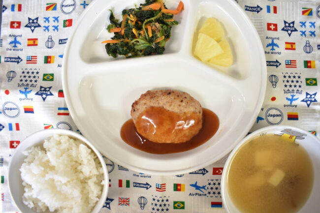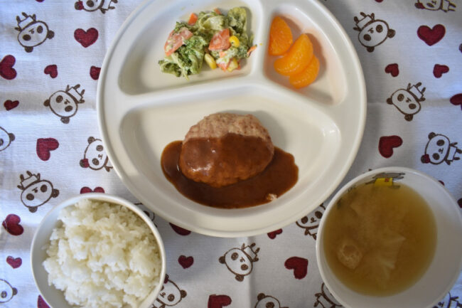 ~ 今日の給食 ~ ・ハンバーグ ・ほうれん草と人参のおかか和え ・ごはん ・豆腐となめこのみそ汁 ・パイン ~ 今日のおやつ ~ ・牛乳 ・お麩ラスク