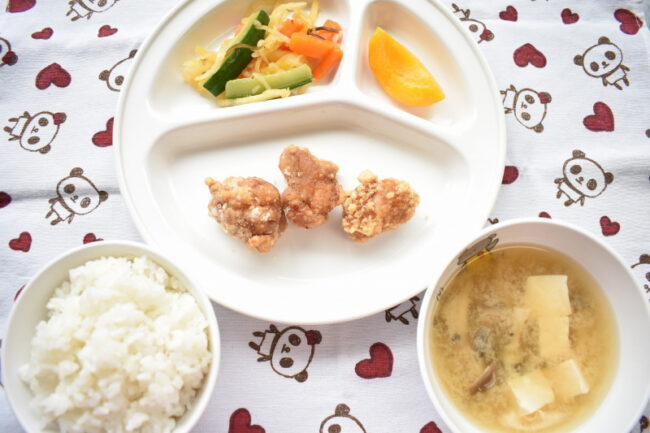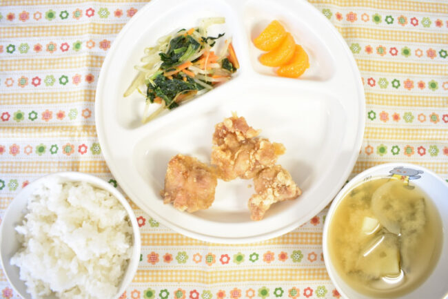 ~ 今日の給食 ~ ・鶏の唐揚げ ・三色ナムル ・ごはん ・じゃがいもと玉ねぎのみそ汁 ・みかん ~ 今日のおやつ ~ ・牛乳 ・マシュマロコーンフレーク