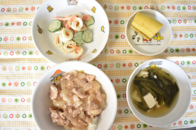 ~ 今日の給食 ~ ・三色丼 ・ちくわときゅうりの和え物 ・キャベツともやしのみそ汁 ・もも ~ 今日のおやつ ~ ・牛乳 ・のり塩ポテトフライ