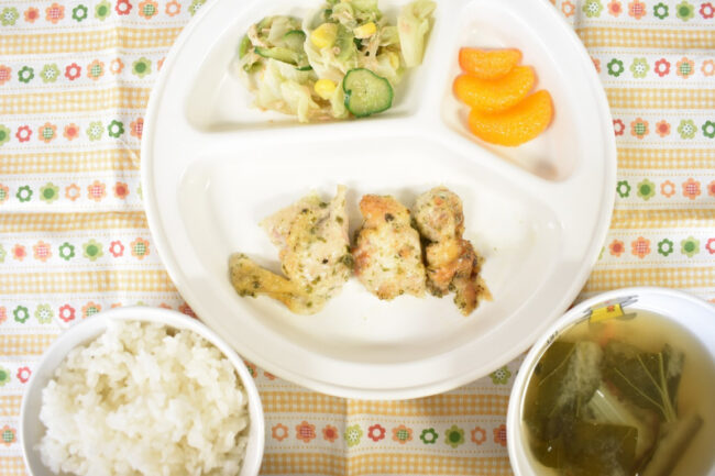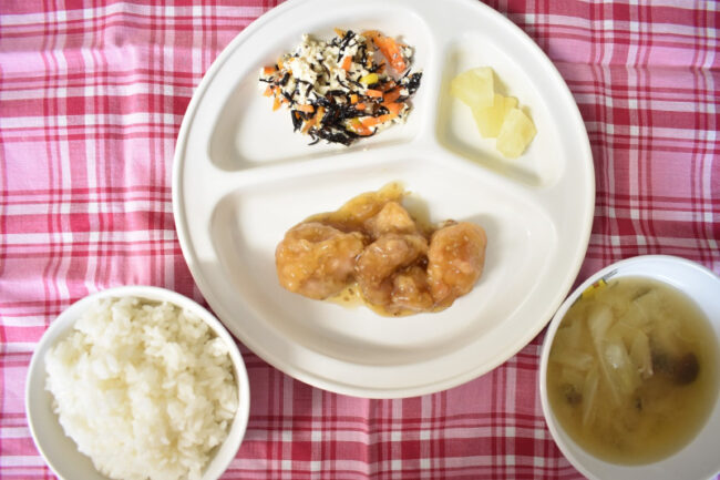 ~ 今日の給食 ~ ・たれ漬け唐揚げ ・ひじきの白和え ・ごはん ・キャベツとしめじのみそ汁 ・パイン ~ 今日のおやつ ~ ・牛乳 ・芋もち田楽
