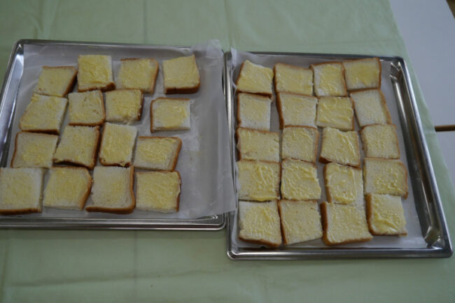 そら組・たいよう組が「シュガートーストづくり」を行いました。 そら組はマーガリンと砂糖を混ぜてクリームを作り、たいよう組は食パンを4等分に切りました。 その後、みんなで食パンにクリー…