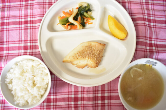 ~ 今日の給食 ~ ・カレイのごま照り焼き ・小松菜とちくわ炒め ・冷やしトマト ・ごはん ・キャベツと油揚げのみそ汁 ・もも ~ 今日のおやつ ~ ・牛乳 ・マカロニきな粉