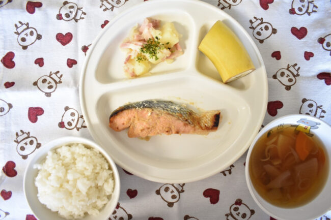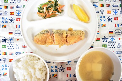 ~ 今日の給食 ~ ・鮭のフライ ・キャベツの納豆和え ・ごはん ・大根と油揚げのみそ汁 ・もも ~ 今日のおやつ ~ ・麦茶 ・お誕生日ケーキ
