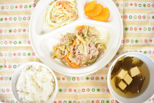 ~ 今日の給食 ~ ・豚肉とキャベツのみそ炒め ・スパゲティーサラダ ・ごはん ・豆腐とわかめのすまし汁 ・みかん ~ 今日のおやつ ~ ・牛乳 ・ジャムサンド