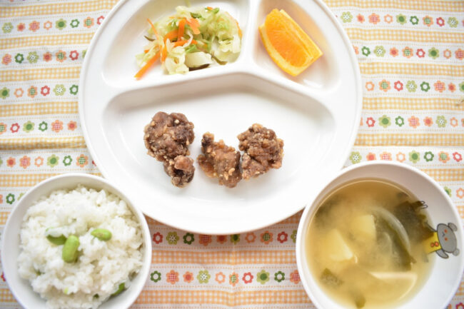 ~ 今日の給食 ~ ・レバーのから揚げ ・キャベツと人参の昆布和え ・ごはん ・えだ豆ごはん ・じゃがいもと玉ねぎのみそ汁 ・オレンジ ~ 今日のおやつ ~ <保育部> ・牛乳 ・あじさいゼリ…