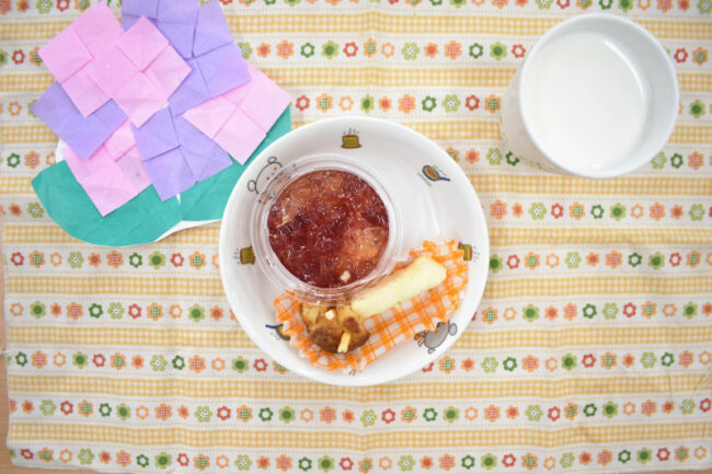 幼稚部は今日、お別れ遠足に行きました。 そして午後おやつにたいよう組は、園庭で食べました。 「今日は特別に園庭で食べよう」と子ども達に言うと、「やったー!」と喜んでいました。 また、カップに入ったフルー…