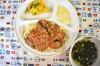 ~ 今日の給食 ~ ・なすのミートソーススパゲティー ・かぼちゃのサラダ ・ほうれん草とコーンのスープ ・パイン ~ 今日のおやつ ~ ・牛乳 ・わかめおにぎり