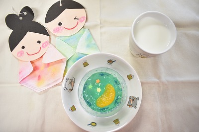 7月7日は「七夕」です。 園では今日、「七夕集会」を行いました。 その為給食では「七夕そうめん」、午後おやつでは「七夕ゼリー」を食べました。 「七夕そうめん」は、ハムを「短冊」、オ…