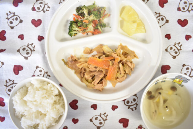 ~ 今日の給食 ~ ・回鍋肉 ・ブロッコリーと人参のゆかり和え ・ごはん ・春雨スープ ・パイン ~ 今日のおやつ ~ ・牛乳 ・フルーツポンチ ・ビスケット