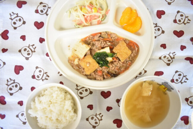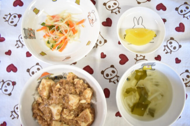 ~ 今日の給食 ~ ・マーボー豆腐丼 ・キャベツの納豆和え ・わかめスープ ・もも ~ 今日のおやつ ~ ・牛乳 ・りんごゼリー ・甘辛せんべい