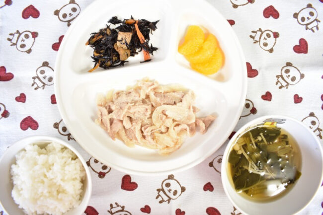 ~ 今日の給食 ~ ・豚肉のみそ焼き ・ひじき煮 ・ごはん ・ほうれん草とえのきのすまし汁 ・みかん ~ 今日のおやつ ~ ・牛乳 ・ポテトフライ