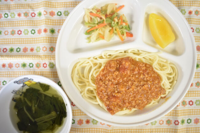 ~ 今日の給食 ~ ・ミートソーススパゲティー ・キャベツと人参のごま和え ・ほうれん草とコーンのスープ ・もも ~ 今日のおやつ ~ ・牛乳 ・おかかおにぎり