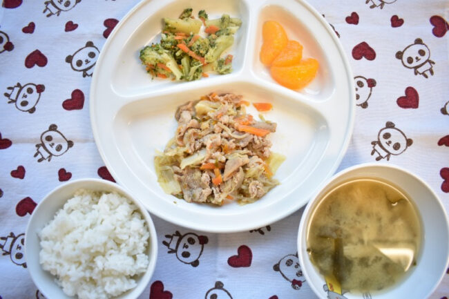 ~ 今日の給食 ~ ・肉野菜炒め ・ブロッコリーと人参のおかか和え ・ごはん ・わかめとえのきのみそ汁 ~ 今日のおやつ ~ ・牛乳 ・マシュマロコーンフレーク