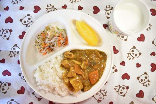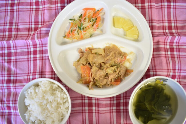 ~ 今日の給食 ~ ・タンドリーチキン ・ひじき煮 ・ごはん ・小松菜ともやしのみそ汁 ・もも ~ 今日のおやつ ~ ・牛乳 ・ココアパンケーキ
