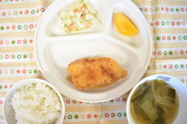 ~ 今日の給食 ~ ・鮭のフライ ・かぼちゃのサラダ ・ごはん ・ほうれん草と油揚げのみそ汁 ・パイン ~ 今日のおやつ ~ ・牛乳 ・すいとん