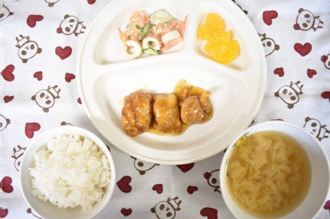 ~ 今日の給食 ~ ・たれ漬け唐揚げ ・ちくわときゅうりの和え物 ・ごはん ・小松菜ともやしのみそ汁 ・もも ~ 今日のおやつ ~ ・牛乳 ・お好み焼き