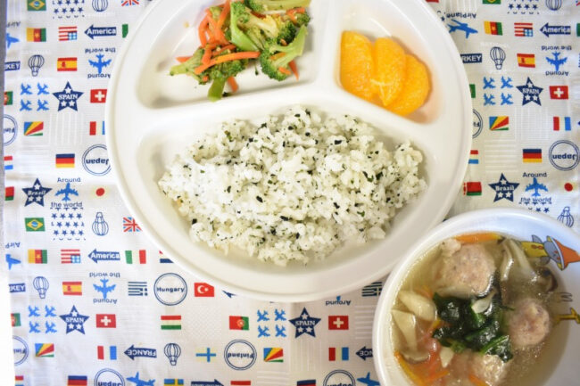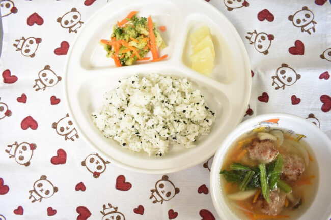 ~ 今日の給食 ~ ・肉団子のスープ ・ブロッコリーと人参のごま和え ・わかめごはん ・パイン ~ 今日のおやつ ~ ・牛乳 ・ぶどうゼリー ・ビスケット