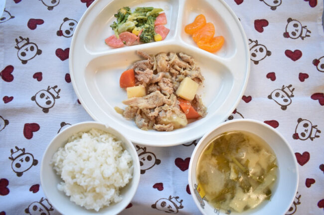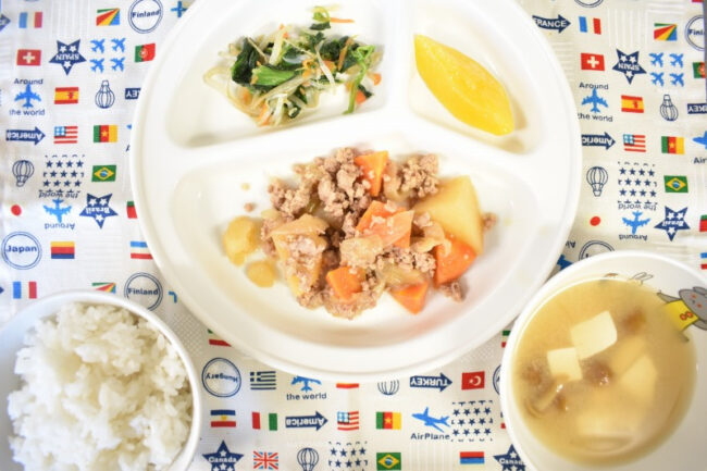 ~ 今日の給食 ~ ・肉じゃが ・ブロッコリーとコーンの和え物 ・ごはん ・かぶと油揚げのみそ汁 ・みかん ~ 今日のおやつ ~ ・牛乳 ・たぬきうどん