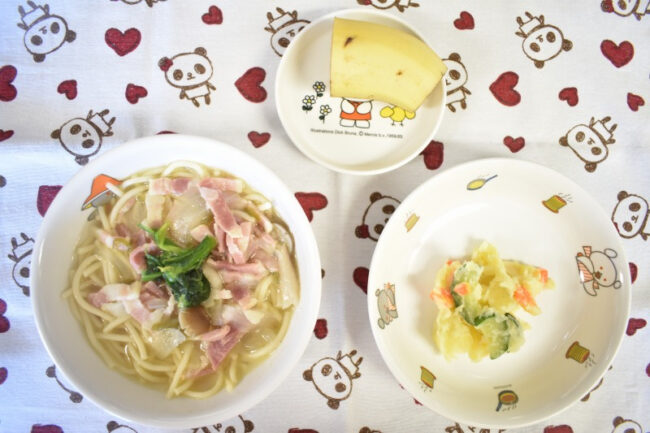 ~ 今日の給食 ~ ・鶏肉のパン粉焼き ・カミカミサラダ ・ごはん ・白菜ともやしのみそ汁 ・もも ~ 今日のおやつ ~ ・牛乳 ・にゅうめん
