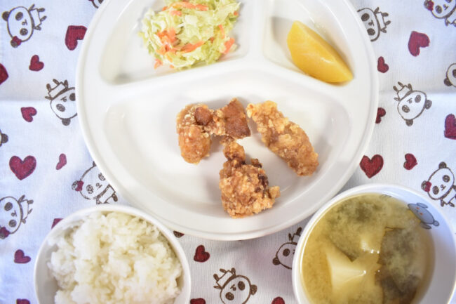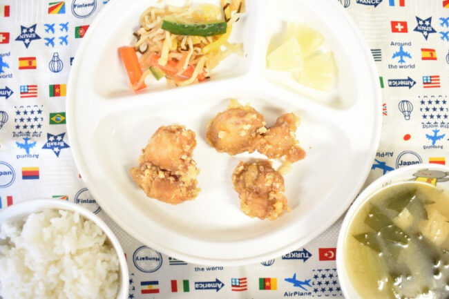 ~ 今日の給食 ~ ・たれ漬け唐揚げ ・ちくわときゅうりの和え物 ・ごはん ・キャベツと油揚げのみそ汁 ・みかん ~ 今日のおやつ ~ ・牛乳 ・薄焼きピザ