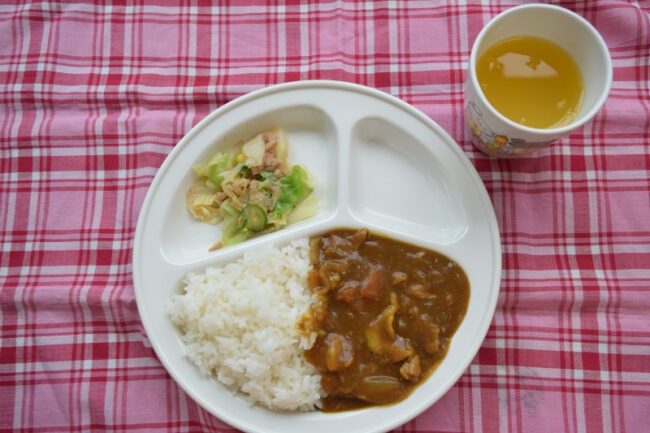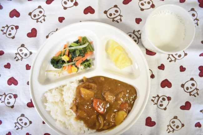 ~ 今日の給食 ~ ・タンドリーチキン ・キャベツの納豆和え ・ごはん ・さつまいもと玉ねぎのみそ汁 ・パイン ~ 今日のおやつ ~ ・牛乳 ・薄焼きピザ