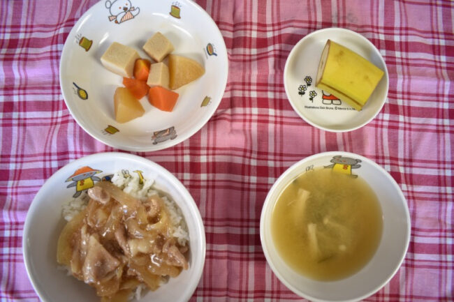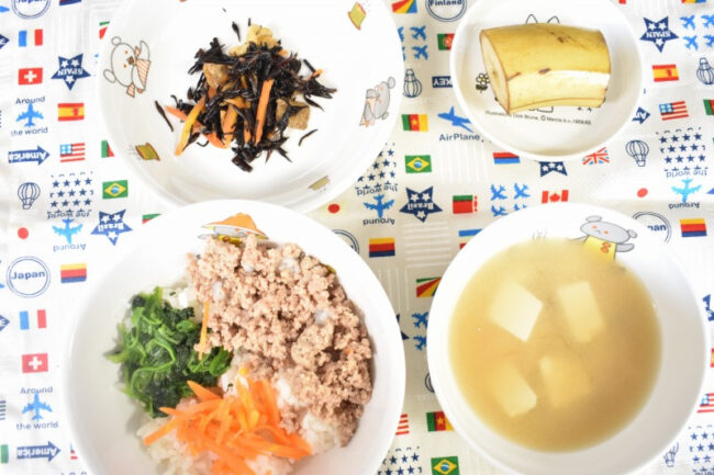 ~ 今日の給食 ~ ・じゃがいものそぼろ煮 ・三色ナムル ・ごはん ・豆腐となめこのみそ汁 ・もも ~ 今日のおやつ ~ ・麦茶 ・豆花(トウファ)