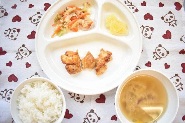 ~ 今日の給食 ~ ・タンドリーチキン ・キャベツと人参の昆布和え ・ごはん ・かぶと油揚げのみそ汁 ・パイン ~ 今日のおやつ ~ ・牛乳 ・チヂミ