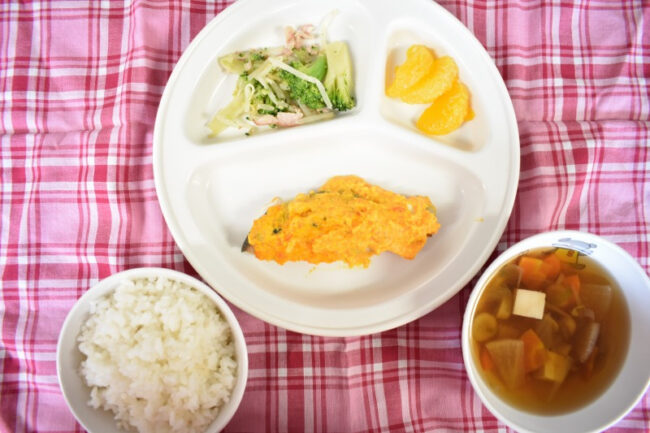~ 今日の給食 ~ ・鮭のもみじ焼き ・ブロッコリーとハムのサラダ ・ごはん ・けんちん汁 ・みかん ~ 今日のおやつ ~ ・牛乳 ・芋もち田楽