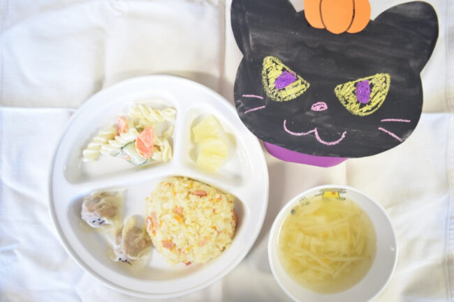 今日は、保育園でも「ハロウィン」を行いました。 その為給食では「おばけしゅうまい」、午後おやつでは「ハロウィンクッキー」を食べました。 子ども達は朝から楽しみにしてくれていて、「今日はごはんもハロウィンだよね」と言う声が…