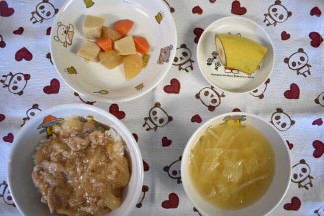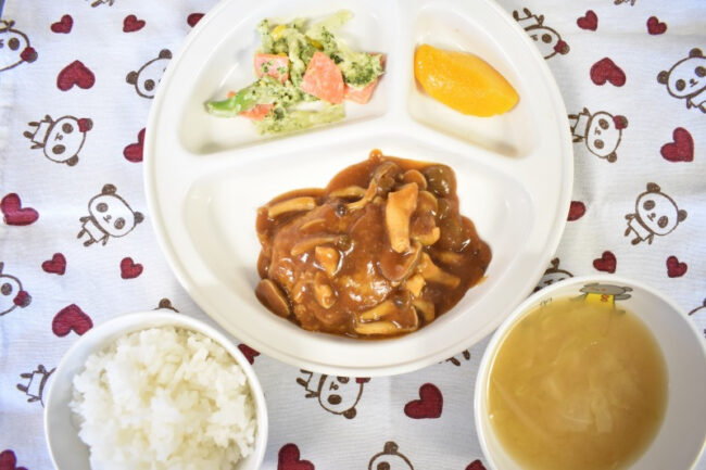 ~ 今日の給食 ~ ・きのこの煮込みハンバーグ ・コールスローサラダ ・ごはん ・さつまいもと玉ねぎのみそ汁 ・もも ~ 今日のおやつ ~ ・麦茶 ・豆花(トウファ)