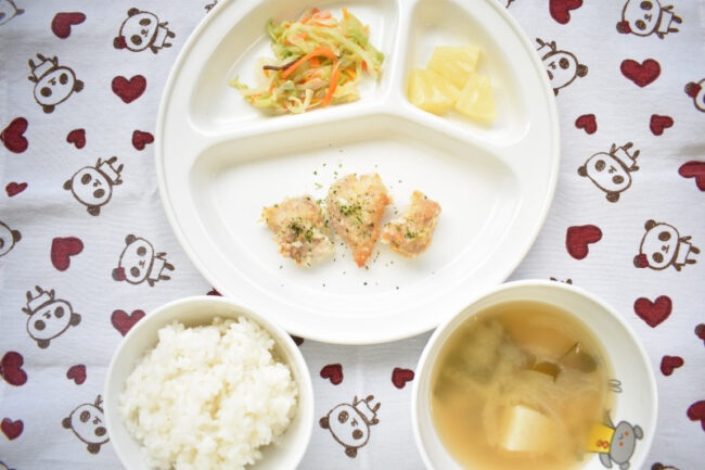~ 今日の給食 ~ ・たれ漬け唐揚げ ・カミカミサラダ ・ごはん ・小松菜とえのきのみそ汁 ・パイン ~ 今日のおやつ ~ ・牛乳 ・お好み焼き